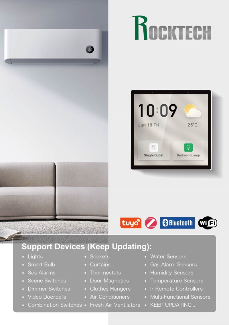 Rocktech RK-A4E on monipuolinen ja älykäs kosketusnäyttö ohjauspaneeli, joka toimii myös TUYA Smart älylaite järjestelmän Zigbee hub -yhdyskäytävänä. Tämä laite on suunniteltu helpottamaan älylaite järjestelmän hallintaa ja parantamaan käyttömukavuutta.