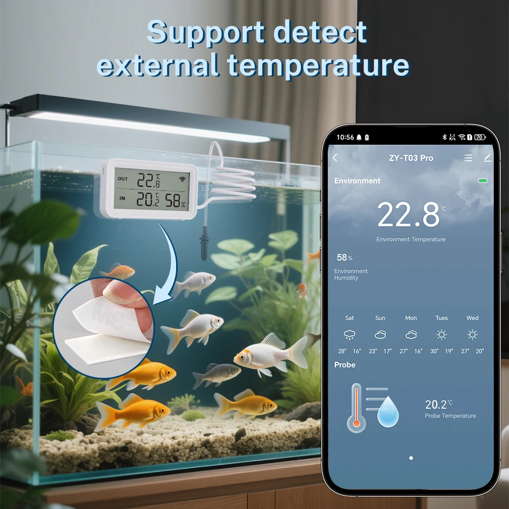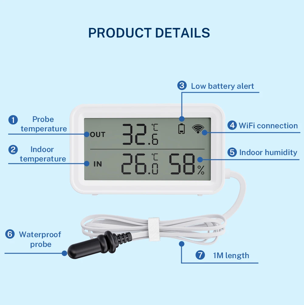 Langaton digitaalinen lämpömittari ulkoanturilla soveltuu kodin, mökin tai huvilan lämpötilan etäseurantaan, jatkuvaan alilämpö valvontaan ja jäätymisvaara hälytyksiin. Etäluettava lämpömittari liitetään TUYA Smart älylaite sovellukseen ja langattomaan WiFi reitittimeen, eli se ei tarvitse älykoti ohjainta (hub).