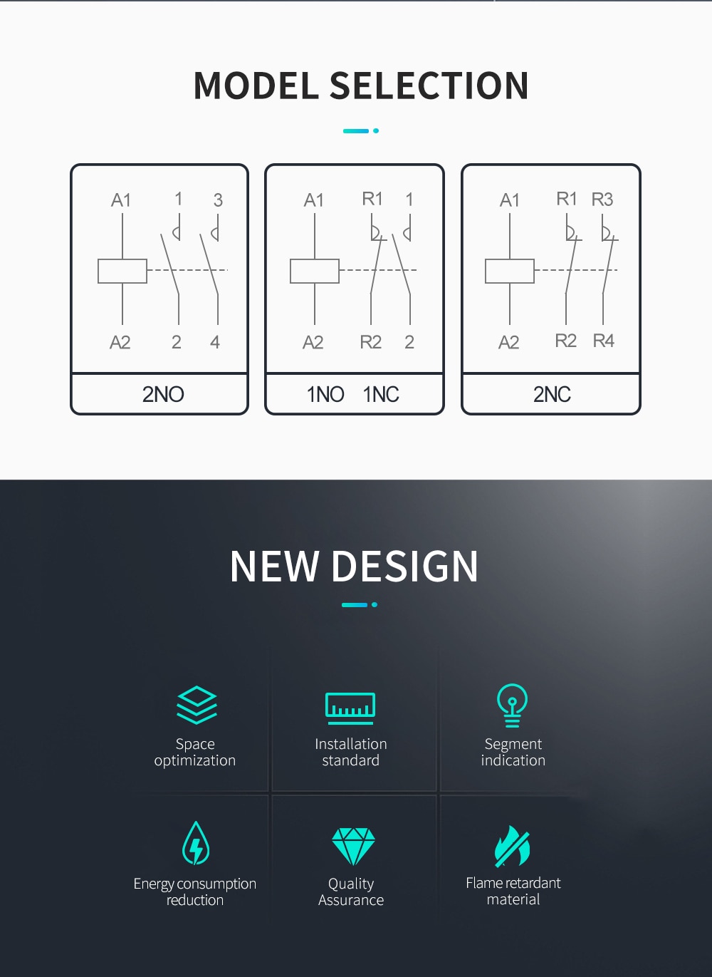 Potentiaalivapaan koskettimen perusmalli rele on 1NO+1NC. Se on yleiskäyttöinen, koska apukosketin välirele sisältää molemmat NO (Normally Open) ja NC (Normally Closed) koskettimet, ja sama välirele sopii useimpiin käyttötarkoituksiin.